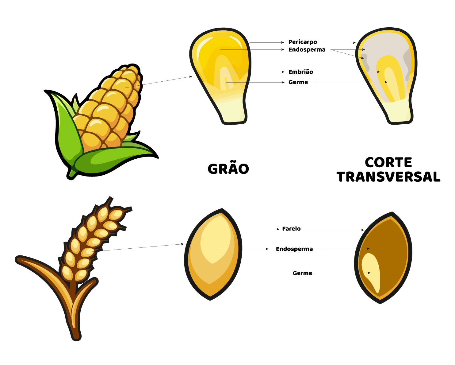 - Endosperma: parte maior do grão, rica em amido.