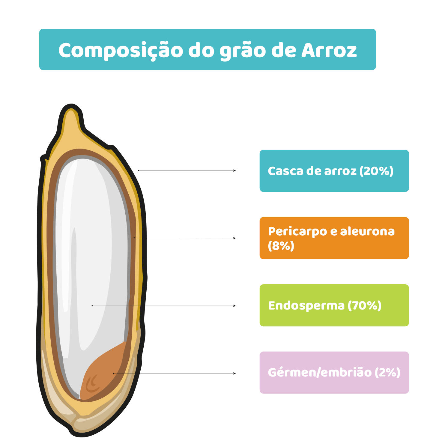 - O farelo de arroz é a fração retirada no polimento e é onde se concentram fibra, proteínas e parte dos lípidos do grão.
