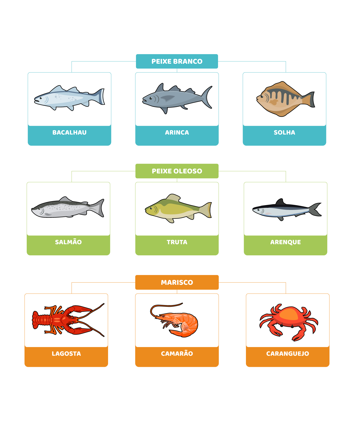 - Peixe: animais aquáticos com espinha (ex.: sardinha, cavala, bacalhau, salmão).