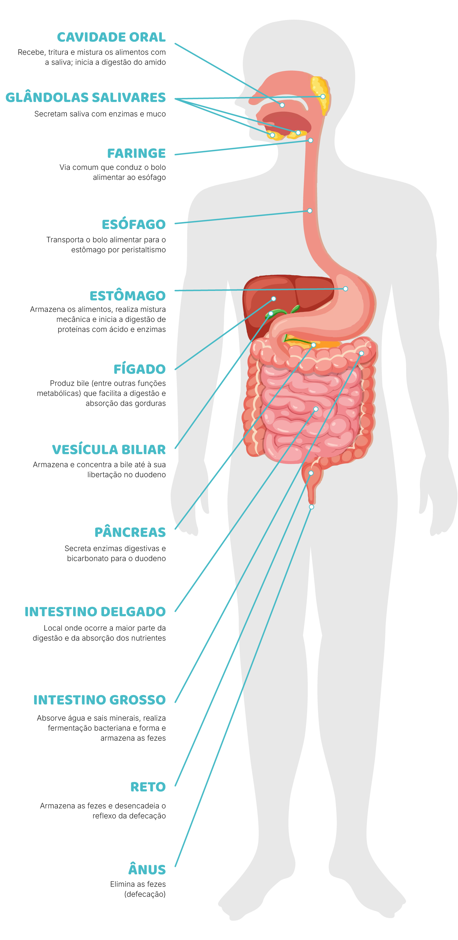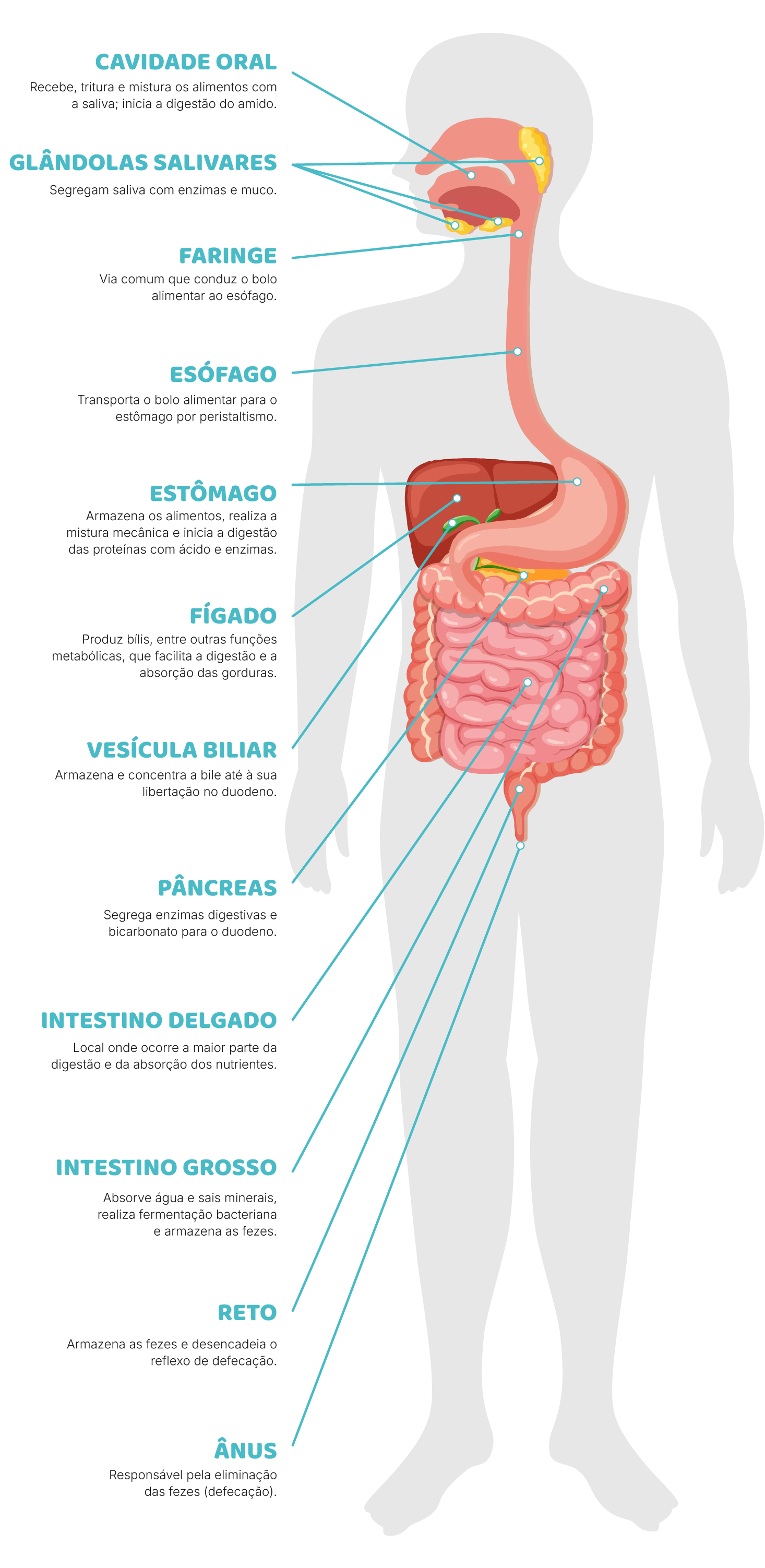 É aqui que tudo começa. Os dentes trituram, a língua empurra o alimento e a saliva humedece e liberta amilase salivar, uma enzima que inicia a digestão do amido. Mastigar bem ajuda a digestão e a saciedade.